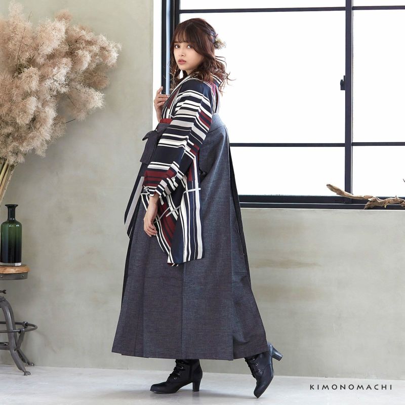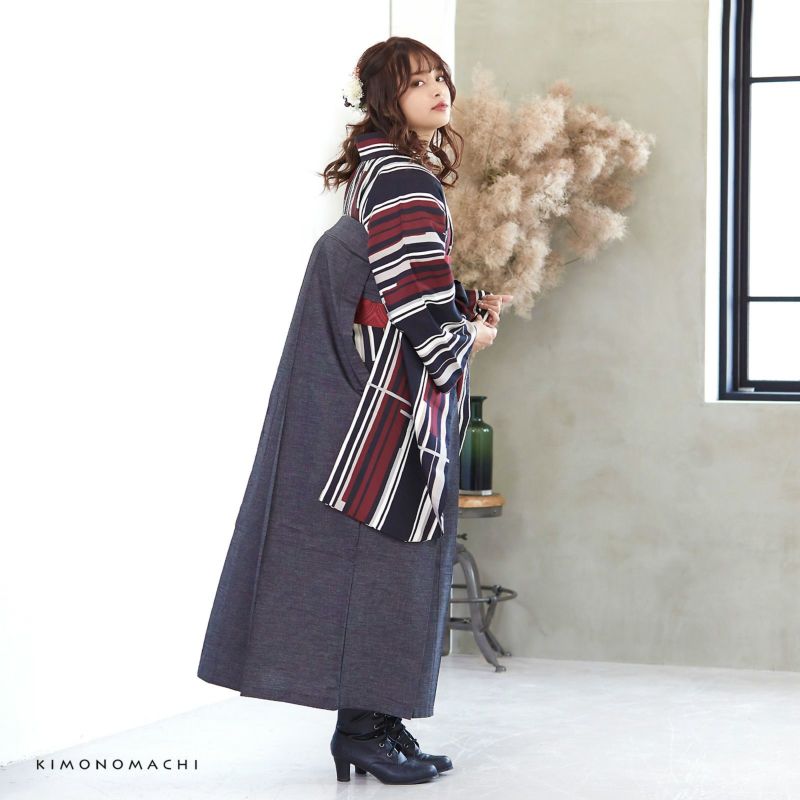 袴 セット 卒業式 女性 4点セット「二尺袖:ラインカラー 灰色×赤+袴:デニム  ブラック+袴下帯:レッド 麻の葉+襦袢」卒業式 女性 レディース お仕立て上がり 袴セット 二尺袖着物セット 着物 二尺着物 袴【メール便不可】