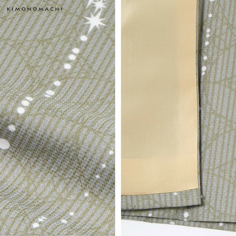 二尺袖着物:グレーの地にベージュグレーの花七宝文様と細かな縞が全体に表現されています。その上に縦に配置された白の大小のドットや星。零れ落ちた星くずのような控えめな輝きを感じさせるデザインです。裏はベージュ。