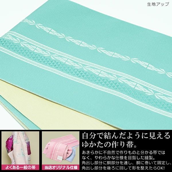 角出し風で、小粋な雰囲気の作り帯です。角出し部分に胴部分を通して、胴にまいて紐を結び、形を整えて、角だし部分を後ろに廻したら完成です。一般的な浴衣の作り帯とは違い、リボン部分に型紙などが入っていませんので、自分で結んだかのような、自然な形になります。(リボン自体には厚紙等入っていません。ですので、自然な形に見えます。)