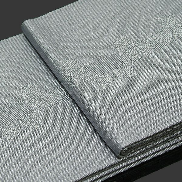 小袋タイプになっておりますので、しっかりと結んでいただけます。表は束ね熨斗がライン状に配した模様、裏は織り模様が細かい縞のようになった無地です。模様が小さめで、ライン状に配しているので、すっきりとシンプルにまとまります。シンプルな帯ですので、キュッと浴衣、コーディネートを引き締めてくれますので、お粋に、格好良く合わせていただけます。