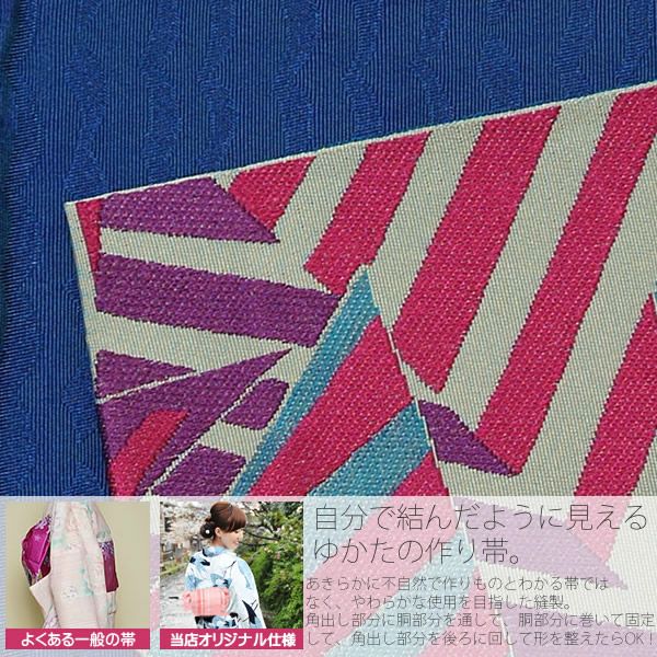 5. 角出し風タイプ結び帯単品「パープル 幾何学ヨット」京都きもの町オリジナル 小袋帯 ゆかた帯 半幅帯 <15浴衣帯11>【メール便不可】