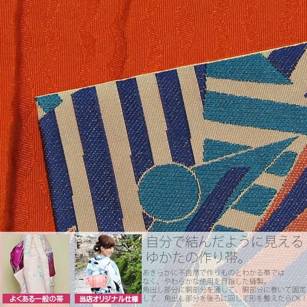 5. 角出し風タイプ結び帯単品「ブルー×オレンジ 幾何学ヨット」京都きもの町オリジナル 小袋帯 ゆかた帯 半幅帯 <15浴衣帯12>【メール便不可】