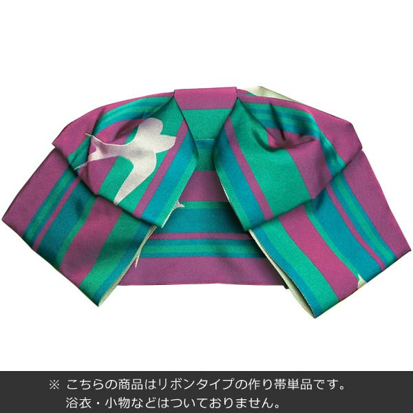 京都きもの町オリジナル 浴衣帯 リボンタイプ結び帯単品「青緑 縞にツバメ」京都きもの町オリジナル へこ帯 ゆかた帯 <15浴衣帯16>【メール便不可】