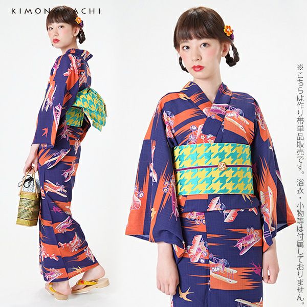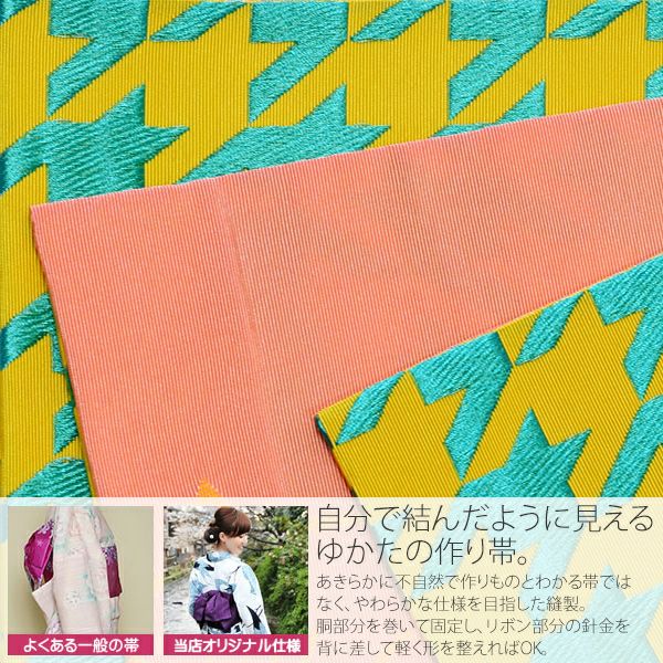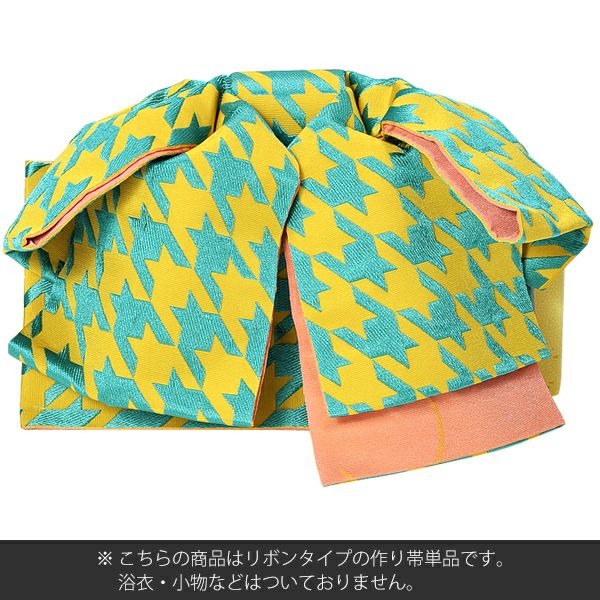 作り帯 京都きもの町オリジナル 浴衣帯 リボンタイプ 結び帯単品「黄×青緑 千鳥」京都きもの町オリジナル 浴衣帯 作り帯 付け帯 【メール便不可】ss2406ohs60