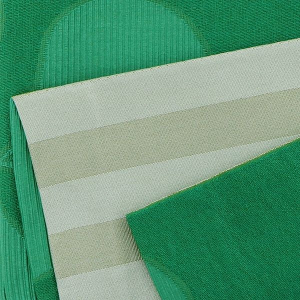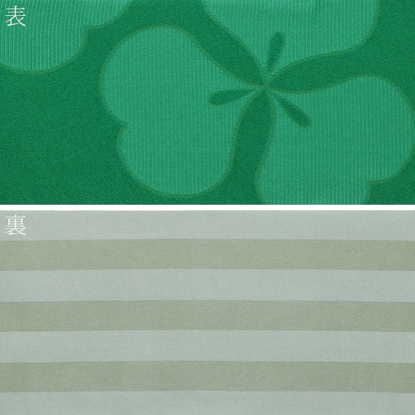 【カラー】鮮やかな緑色。ハート型を三枚合わせたようなカタバミモチーフの模様。裏は、白っぽい浅い抹茶色、縞模様。