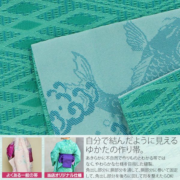 作り帯 京都きもの町オリジナル 浴衣帯 【Prices down】角出し風タイプ 結び帯単品「青緑色 菱格子」京都きもの町オリジナル 浴衣帯 作り帯 付け帯 【メール便不可】