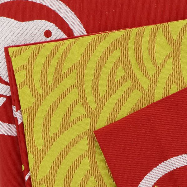 【カラー】少し暗めの色目の濃い赤色地に千鳥、帆船、蝶の丸紋。裏は、鮮やかな明るく濃い黄色の波模様。