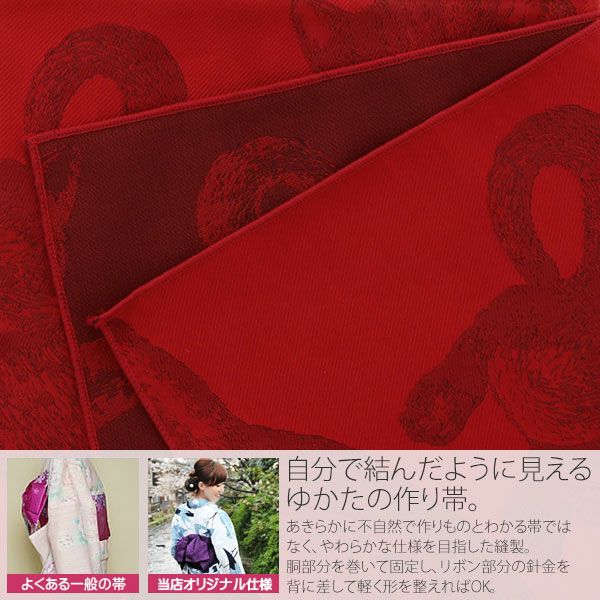 作り帯 京都きもの町オリジナル 浴衣帯 リボンタイプ 結び帯単品「レッド 猫」京都きもの町オリジナル 浴衣帯 作り帯 付け帯 【メール便不可】