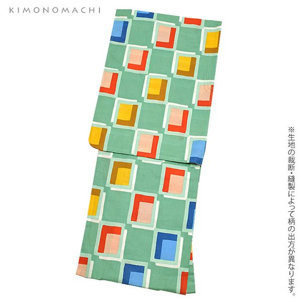 【カラー】浴衣はコバルトグリーンをベースに、規則的に並んだちょっとスモーキーな赤×ピンク、黄色×からし色、濃淡のブルーのタイル模様。ちょっぴりレトロな可愛らしさが漂うデザイン。帯は赤ピンクの細かな縞模様。