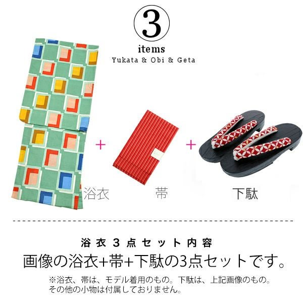 画像の女性浴衣と浴衣帯、下駄(フリーサイズ)のついた浴衣3点セットです。