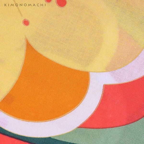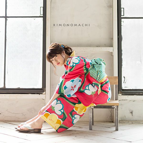 【カラー】浴衣は黄みが強い明るいピンク色地に、濃淡2色の緑色の流線模様。その上に、丸いシルエットが可愛らしい梅の花。花は明るい黄色とオレンジ色、水色とくすんだ青緑色などの色使いで、コントラストもはっきりと、カラフルな印象に。帯は、青緑、イエローの色合い。