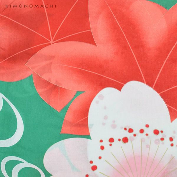 【カラー】浴衣は、明るく鮮やかな緑色地に、白色の流線模様。その上に、大きな桜と楓。桜はごく薄いピンク色に、中心はほんのりと濃いピンク色に朱色。楓は明るめの朱色。葉の淵と葉脈部分は薄い朱色。帯は鮮やかな黄色の色合い。