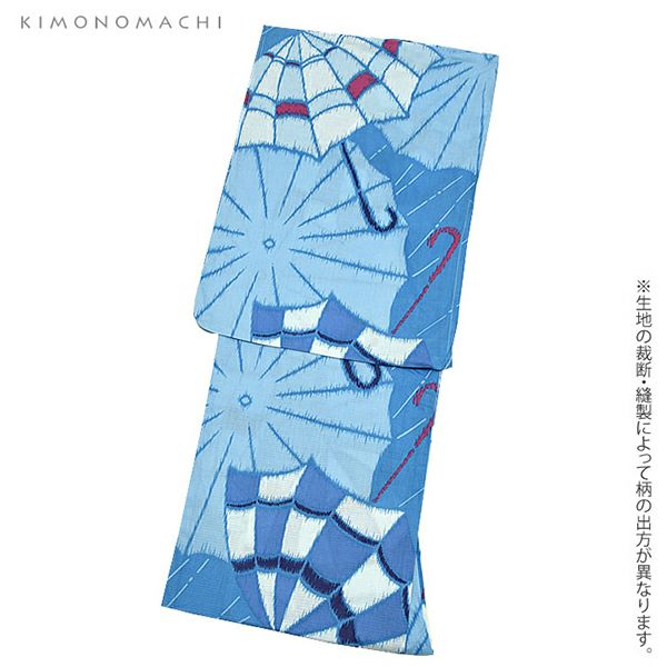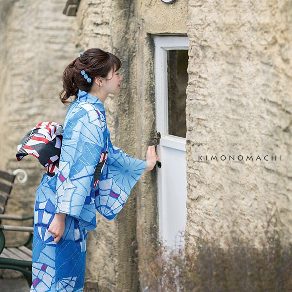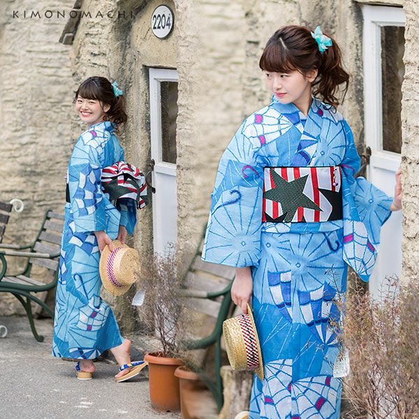 【カラー】浴衣は落ち着いた水色に、大胆に描かれた銘仙調の大きな傘の模様。帯は赤×白色のストライプに黒色の星模様。