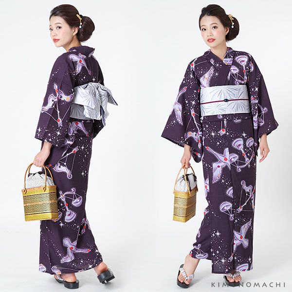 【カラー】浴衣は暗い紫紺色地に、星の輝く空をイメージ。キラキラと輝いているかのような星座モチーフ、濃淡の紫色のグラデーション。帯は白っぽい淡い鼠色地に花火模様。