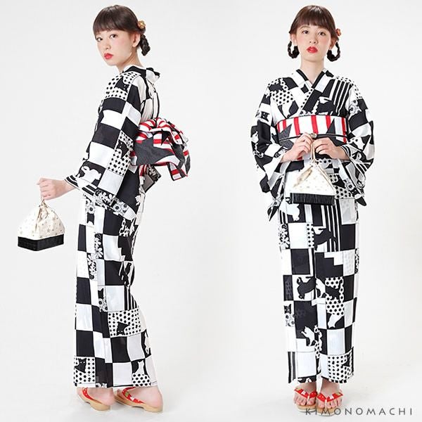 【カラー】浴衣は黒色×白色の大きな格子柄部分のところどころに、水玉とストライプ、レトロ調のお花に、猫のシルエット。帯は赤×白色のストライプに黒色の星模様。