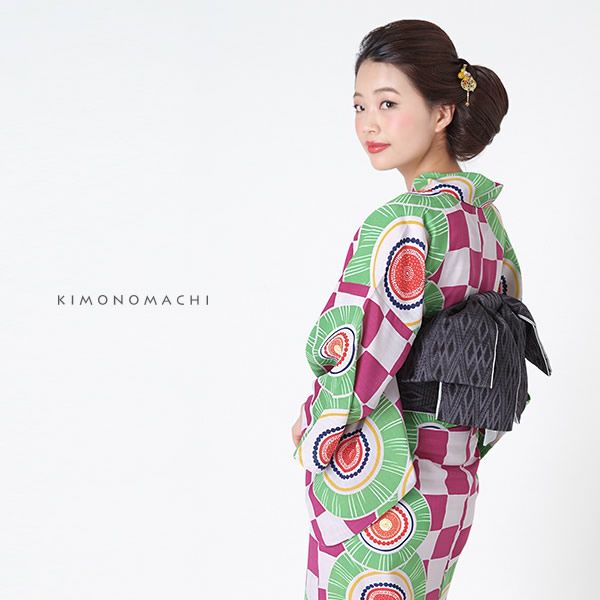 【カラー】浴衣はごく薄いグレー地に赤味のある紫色を配した、ちょっとポップな市松模様の上に幾何学模様が重なったモダン雰囲気。帯は黒グレーの菱格子模様。