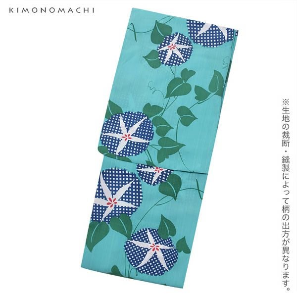 【カラー】浴衣はターコイズ系のグリーン地に、朝顔の花と葉と蔓模様がシンプルで可愛らしい雰囲気。帯はこっくりとした濃い赤色の色合い、猫模様。