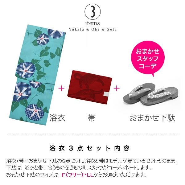 京都きもの町オリジナル浴衣福袋の浴衣、浴衣帯に下駄がついた浴衣3点セットです。浴衣はテイジンの高機能ポリエステル素材を使用した浴衣で汗でべとつかずサラサラでしわになりにくく、快適に着れる浴衣です。※下駄はおまかせです。