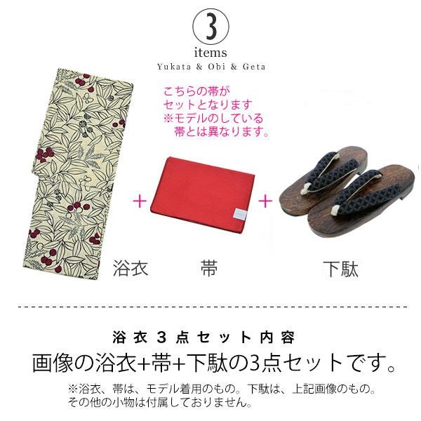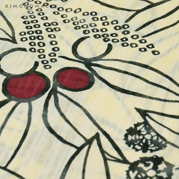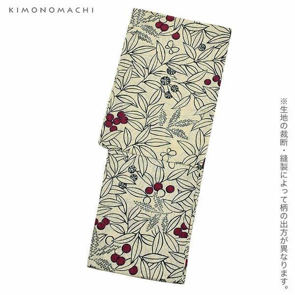 【カラー】浴衣は生成り色地に葉っぱ模様。ところどころに赤い実、小さな蝶々模様。帯は和紙風の風合いのある濃い赤色。