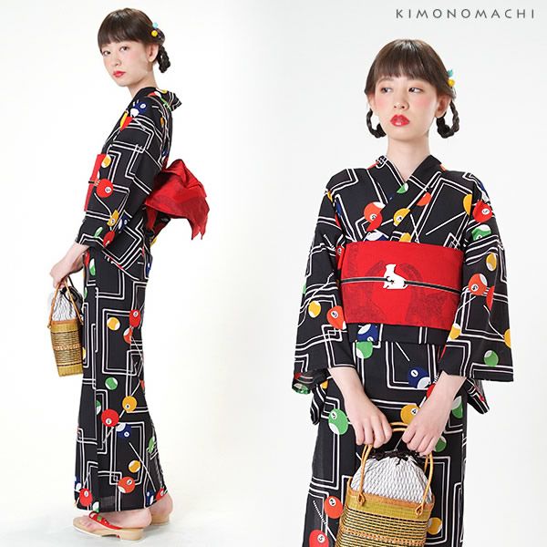 【カラー】浴衣は黒地にビリヤード台、カラフルなビリヤードの玉とキュー柄。帯は和紙風の風合いのある濃い赤色。