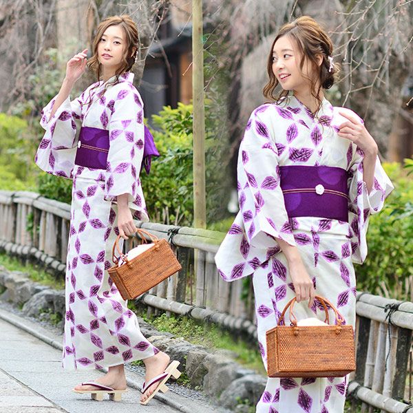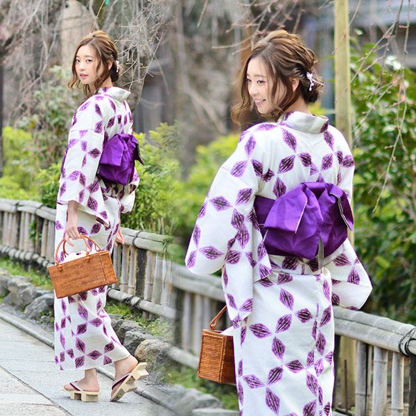 【カラー】浴衣は白地に紫色の絞り風のオモダカ模様。帯は濃い紫色。