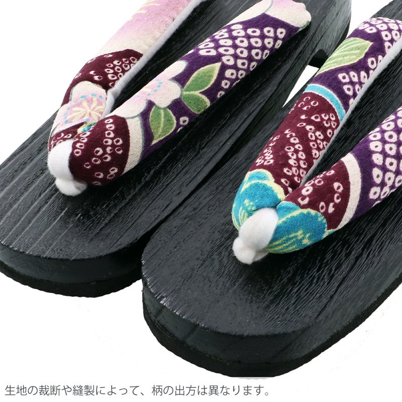 【カラー】鼻緒は紫を基調とした疋田鹿の子に桜。前坪は白。台は黒台。