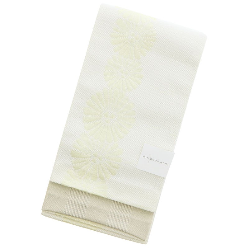 【カラー】アイボリー系の白に、ごく淡い黄色の花模様が並んだ帯。菊花のような唐松文様のような、シンプルながらどこか古典的な雰囲気のあるデザイン。裏は灰白色に織の二筋の縞。