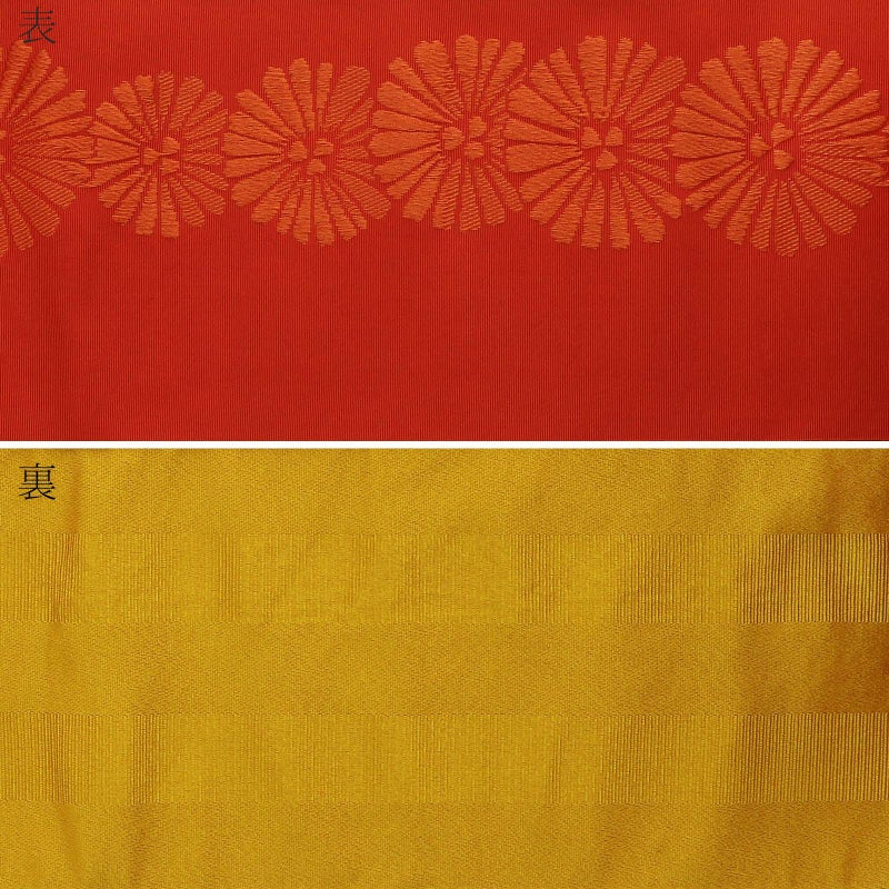 【カラー】明るい黄系の赤に、深いオレンジ色の花模様が並んだ帯。菊花のような唐松文様のような、シンプルながらどこか古典的な雰囲気のあるデザイン。裏は金茶色の地に織の二筋の縞。