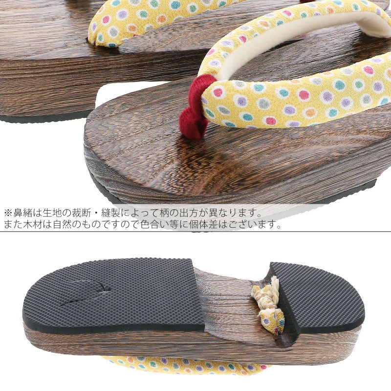 【カラー】鼻緒は淡黄色の地に、白と赤、緑、薄紫、オレンジなどの水玉模様。前坪は臙脂色。台は焼桐の焦げ茶色。