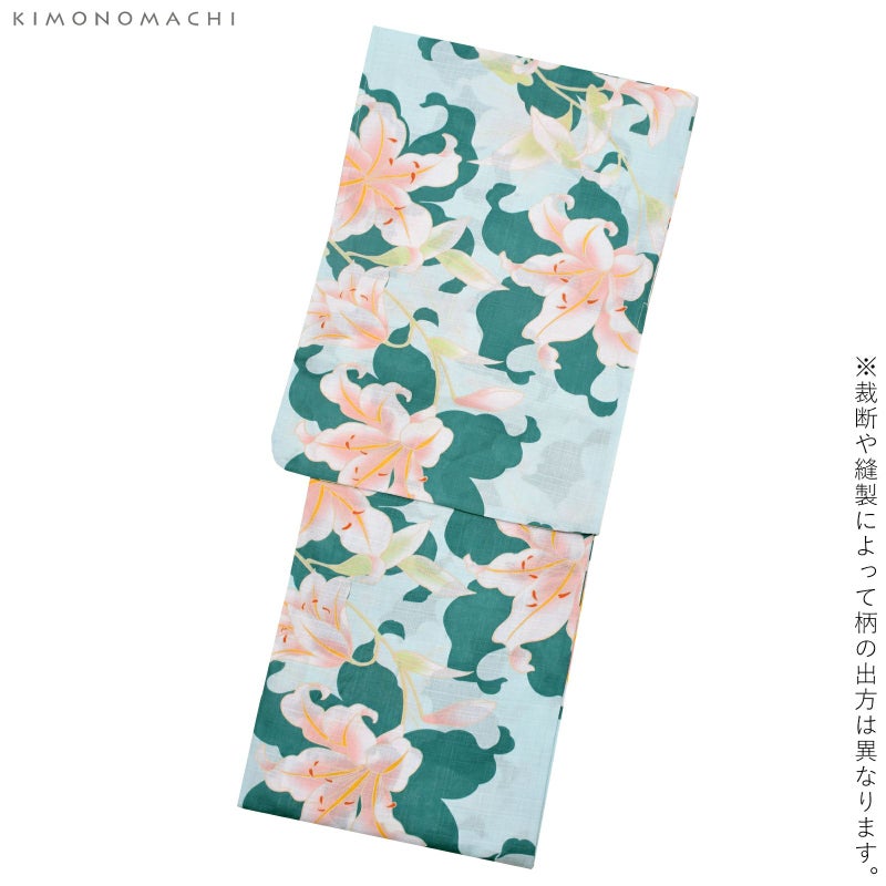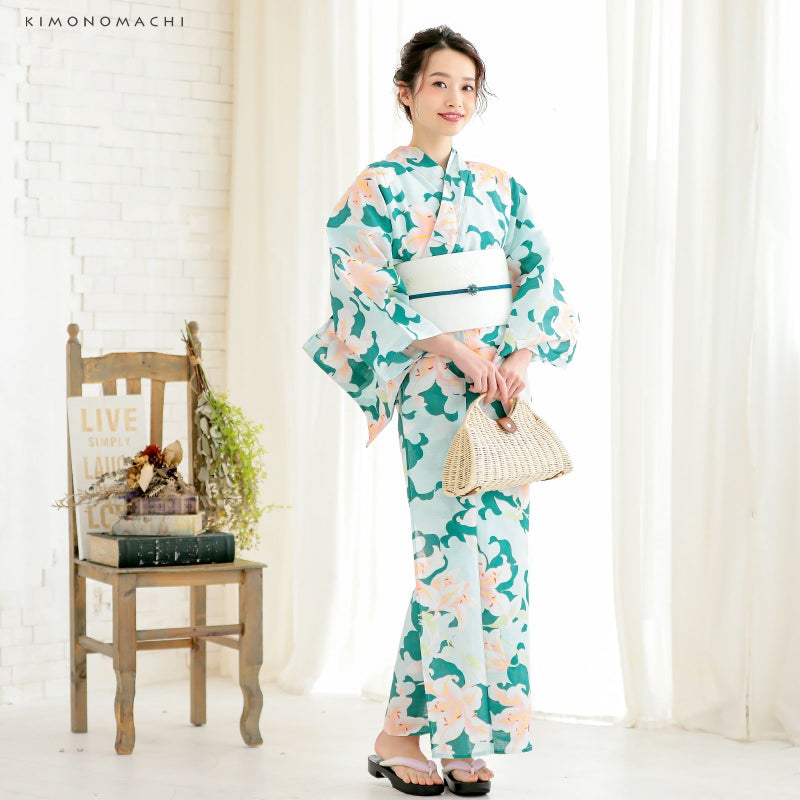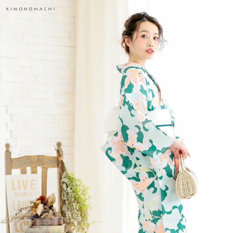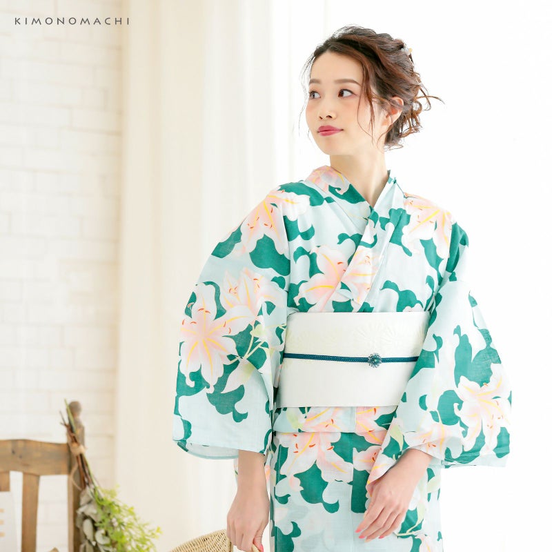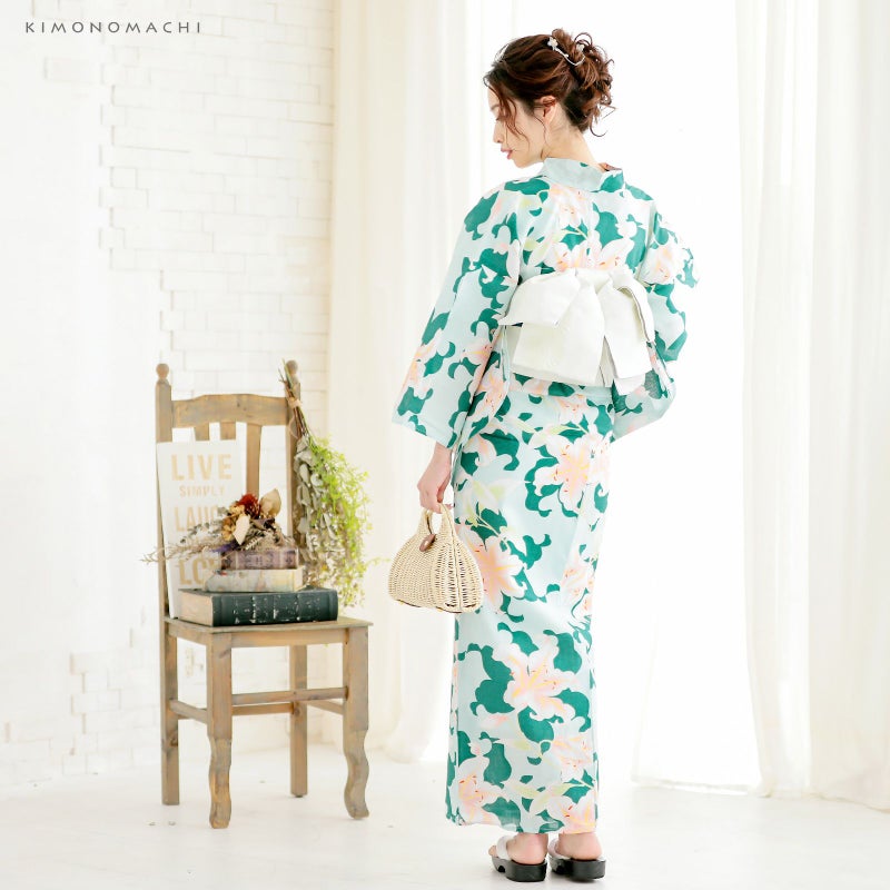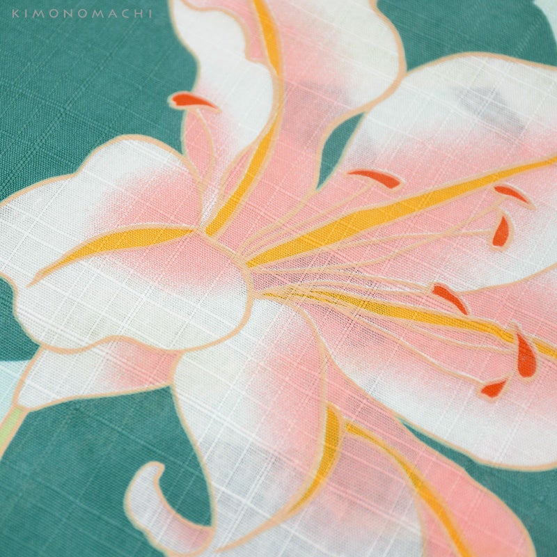浴衣:薄いウォーターグリーン地に青みを含んだ濃い緑色の百合のシルエット、赤ピンクぼかしの色合いの入った百合模様。