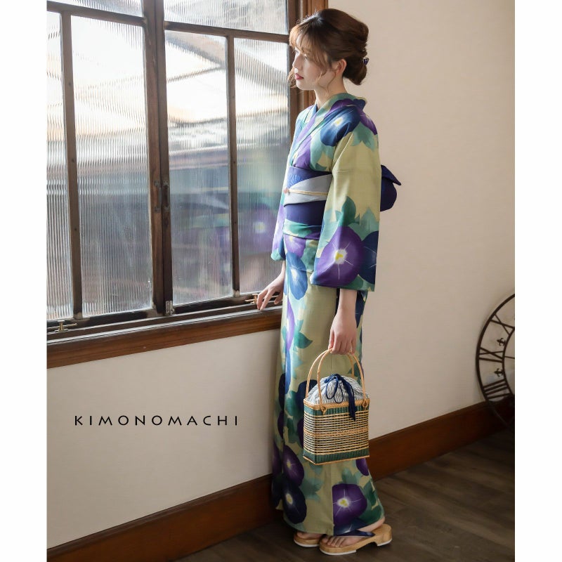 浴衣:灰みの薄黄緑色の地に、大輪の朝顔が縦の流れに配置されたデザイン。濃淡のある紺青や紫色に白い曜の入ったお花はしっとりとみずみずしく、錆びた青磁色や青鈍色の葉が奥行きを生み出しています。
