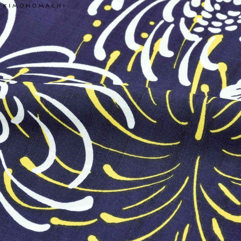 浴衣:青紫みの紺色の地。白抜きの管物の菊の合間に、冠菊の花火が開いています。花火の黄色や淡い青灰色が変化を与えています。