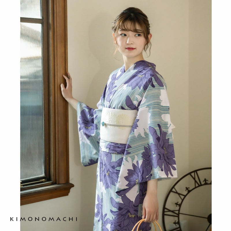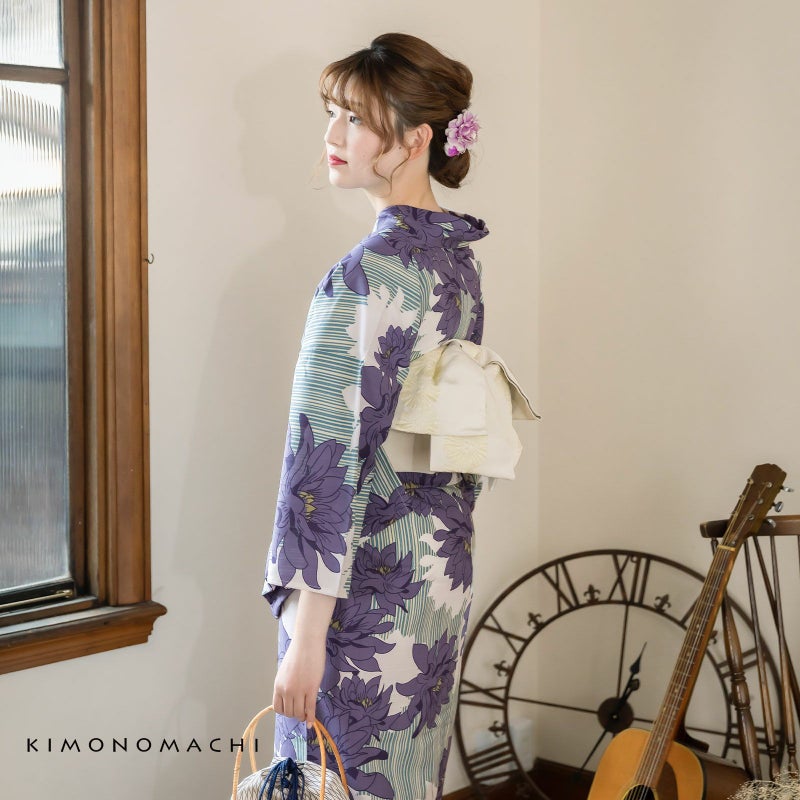 浴衣:淡いウォーターグリーンにグレイッシュな水色の乱調のストライプの地、大きなダリアの花を散らしたデザイン。深い藤鼠色のお花に、抹茶色の蕊がポイントです。白抜きのシルエットが奥行きのある印象に。