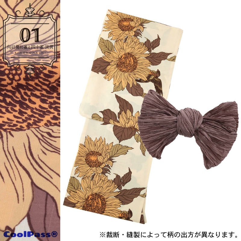 浴衣:やや青みの灰色の地。濃い青緑色の線で描かれた花鳥画風のヒマワリにスズメやシジュウカラ。浅い山吹色の花芯に明るい灰みの黄色の花びら、浅い青緑色や青磁色の葉。同色の羽根に浅い山吹色が印象的な雀が花に溶け込むように飛び寄っています。夏の日にも涼し気な色調がモダンな浴衣です。