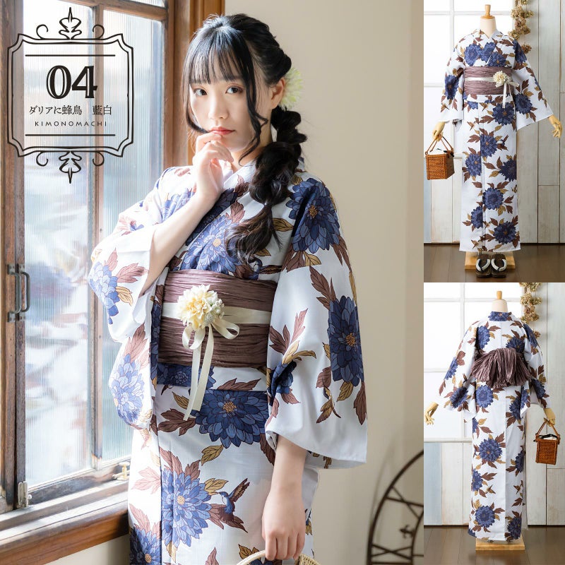 浴衣:ごくわずかに灰青みを帯びた白の地。こげ茶の線で描かれた花鳥画風のダリアにハチドリ。くすんだ黄色の花芯に青藍の花、茶褐色や白橡色の葉。同色の羽根に白い腹が印象的なハチドリが花の間で羽ばたいています。涼し気な地色と侘びた色調の花鳥が、凛々しさと中性的な魅力を放っています。
