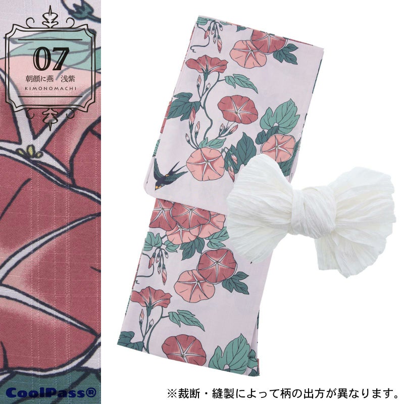吸水速乾、CoolPass素材使用のポリエステル浴衣、レディース浴衣と兵児帯の2点セットです。