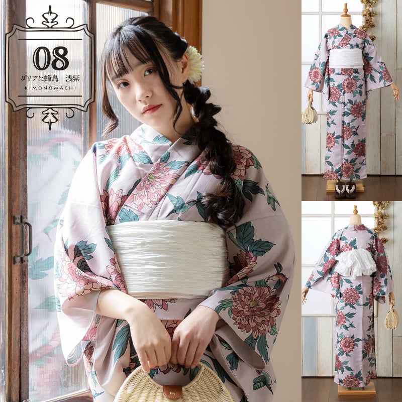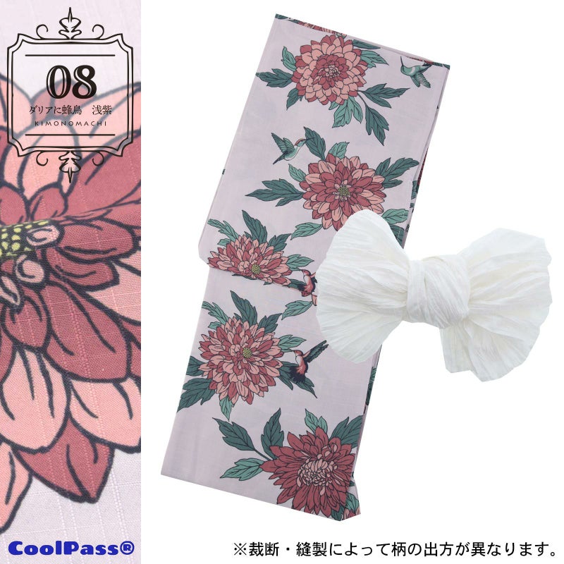 浴衣:やや灰みの淡い赤紫色系の地。濃い青緑色の線で描かれた花鳥画風のダリアにハチドリ。明るい灰みの黄色の花芯に鈍い薄赤の花、浅い青緑色や青磁色の葉。同色の羽根に白い腹が印象的なハチドリが花の間で羽ばたいています。やわらかな地色と浅い色調の花鳥が、他にはない魅力を放っています。