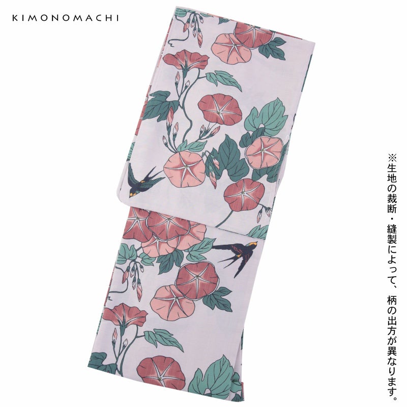 浴衣:やや灰みの淡い赤紫色系の地。濃い青緑色の線で描かれた花鳥画風の朝顔にツバメ。白い曜に鈍い薄赤の花、浅い青緑色や青磁色の葉。浅い黒の羽根に山吹色の喉が印象的なツバメが花の間を飛び交っています。やわらかな地色と落ち着いた色調の花鳥が、粋な魅力を放っています。