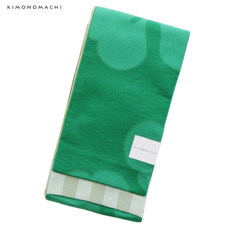 帯:鮮やかな緑色。ハート型を三枚合わせたようなカタバミモチーフの模様。裏は、白っぽい浅い抹茶色、縞模様。