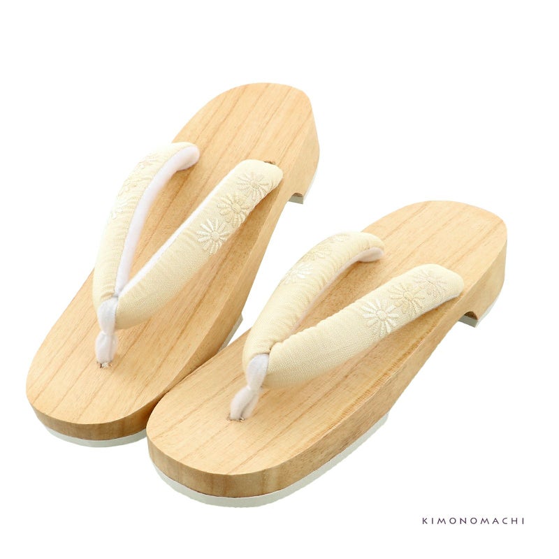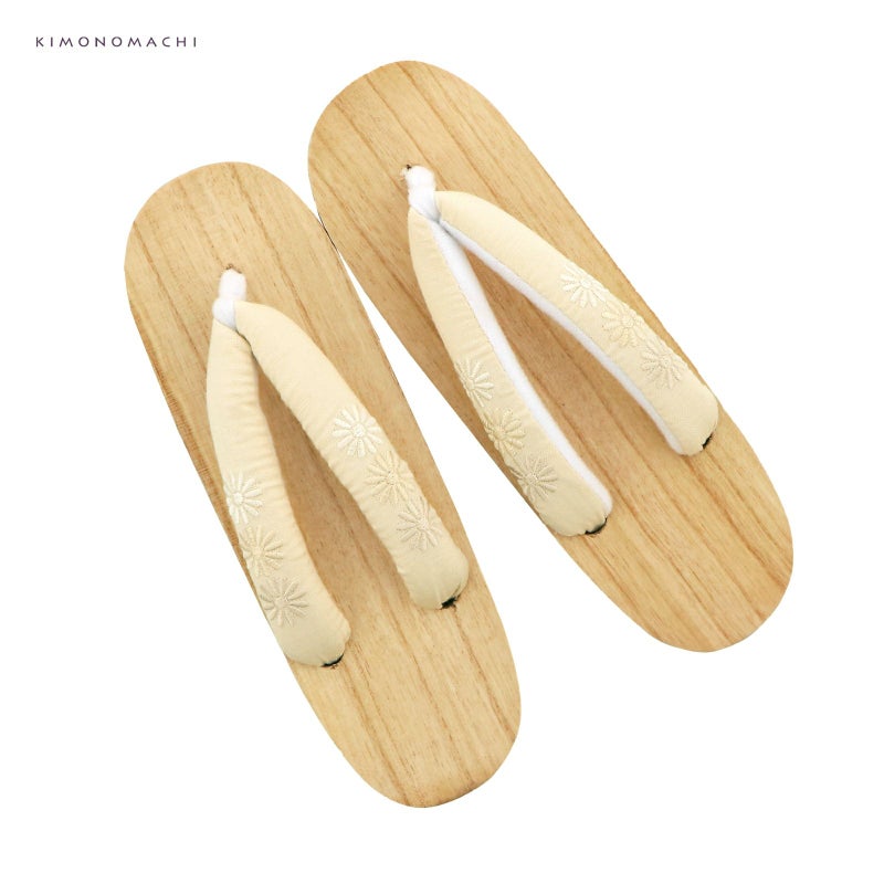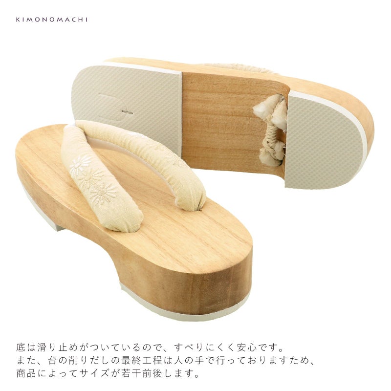京都きもの町オリジナルの女性下駄です。台は桐の白木で、鼻緒に刺繍が入っています。鼻緒は裏地がふわふわですので、擦れて痛くなりにくい下駄です。また、ゴム底なので、滑りにくく安心です。浴衣に合わせて、オシャレな下駄を合わせてみてはいかがでしょうか。