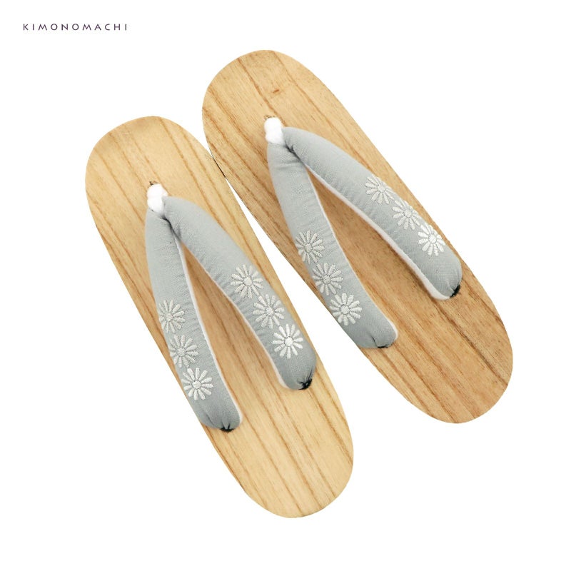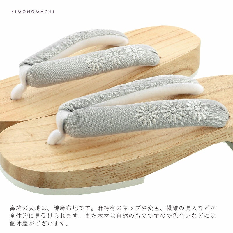 【色柄】素朴な質感の明るいグレーの鼻緒に、レトロなお花の刺繍。白鼠色、ごく淡いグレージュ、淡いグレージュの3色の刺繍の花がさりげないオシャレです。