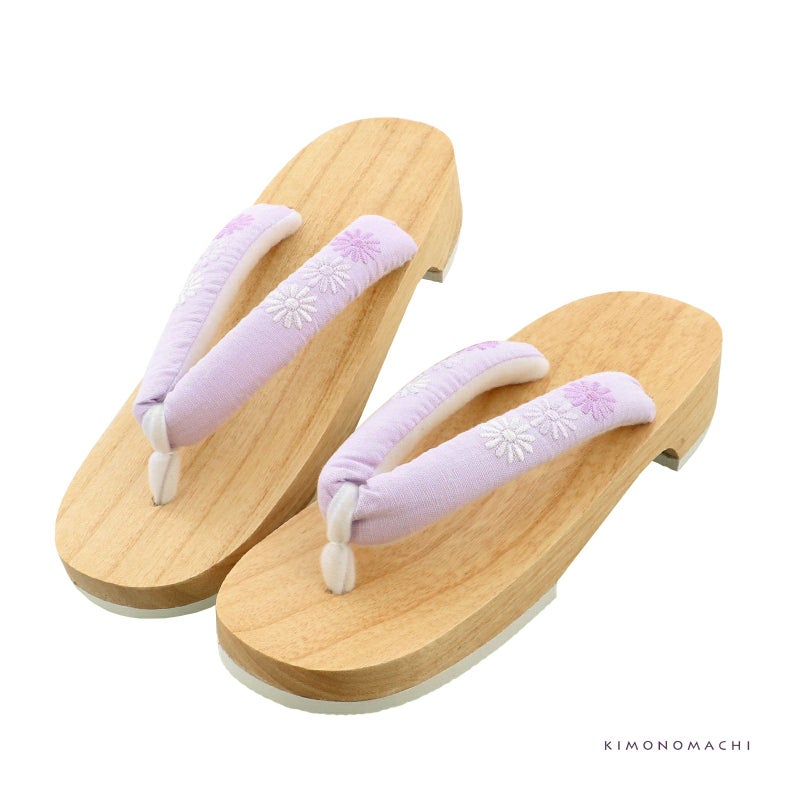 【色柄】素朴な質感の浅い薄紫色の鼻緒に、レトロなお花の刺繍。パープル、ごく淡い白藤色、白の3色の刺繍の花がさりげないオシャレです。