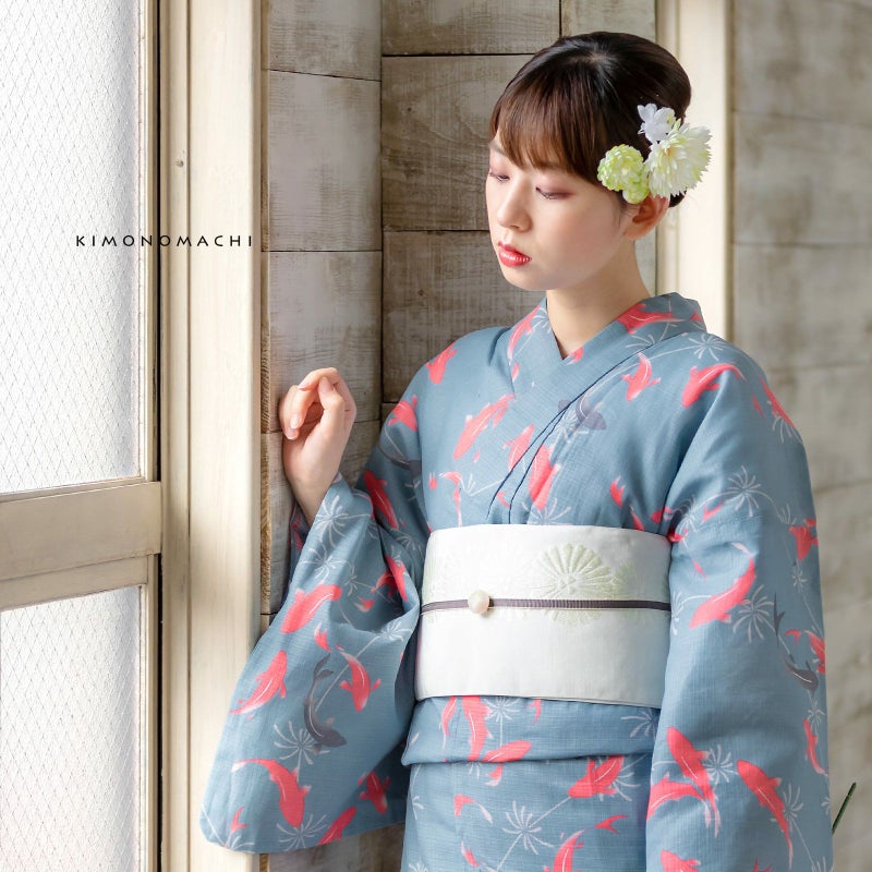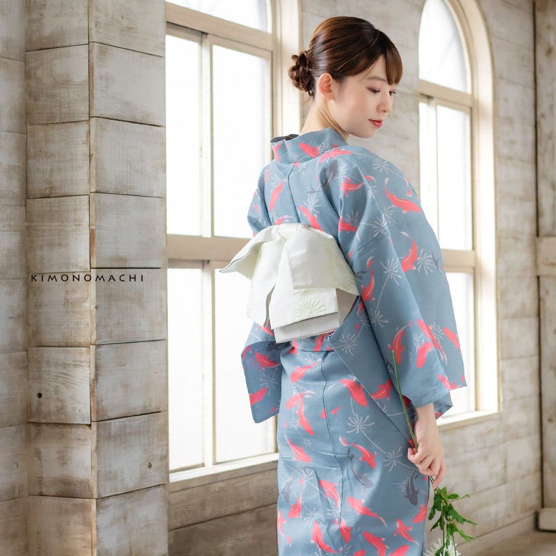 浴衣:落ち着いたグレイッシュな水色の地に、淡いグレーの水草、明るいピンクと薄墨色の金魚の柄。金魚の体の濃淡のぼかしがアクセントとなっています。曲線を描く水草の間を、和金のようなすっきりとしたシルエットの金魚が泳ぐ、金魚鉢を上から見ているかのようなデザインです。スモーキーな地の色と浮き立つような明るいピンクの他にはない色遣いが魅力です。