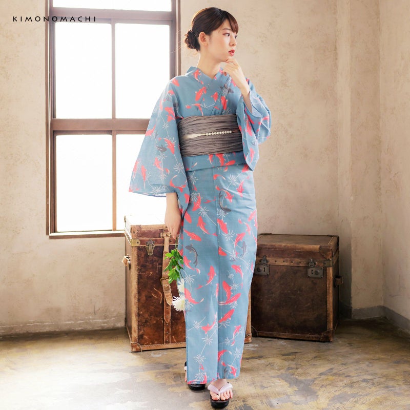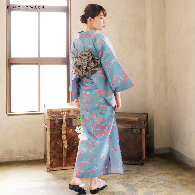 浴衣:落ち着いたグレイッシュな水色の地に、淡いグレーの水草、明るいピンクと薄墨色の金魚の柄。金魚の体の濃淡のぼかしがアクセントとなっています。曲線を描く水草の間を、和金のようなすっきりとしたシルエットの金魚が泳ぐ、金魚鉢を上から見ているかのようなデザインです。スモーキーな地の色と浮き立つような明るいピンクの他にはない色遣いが魅力です。