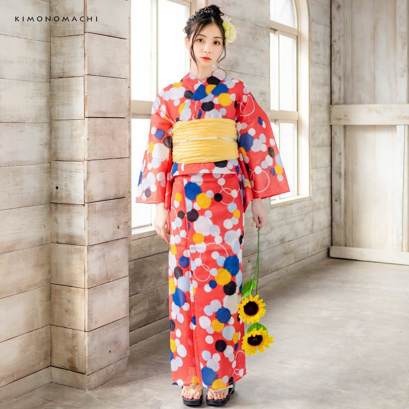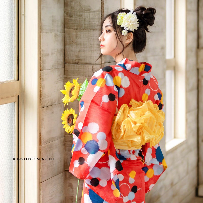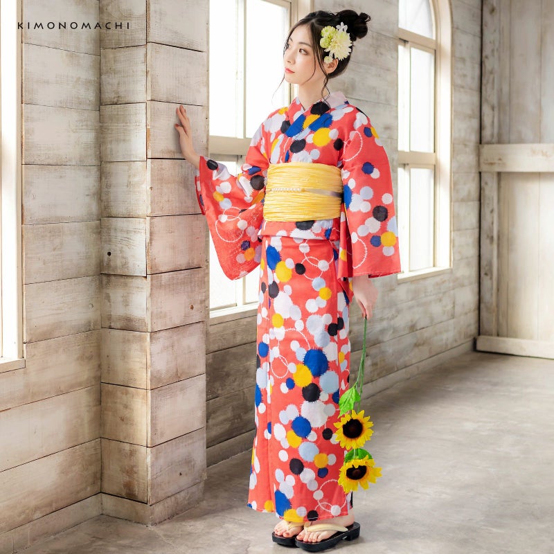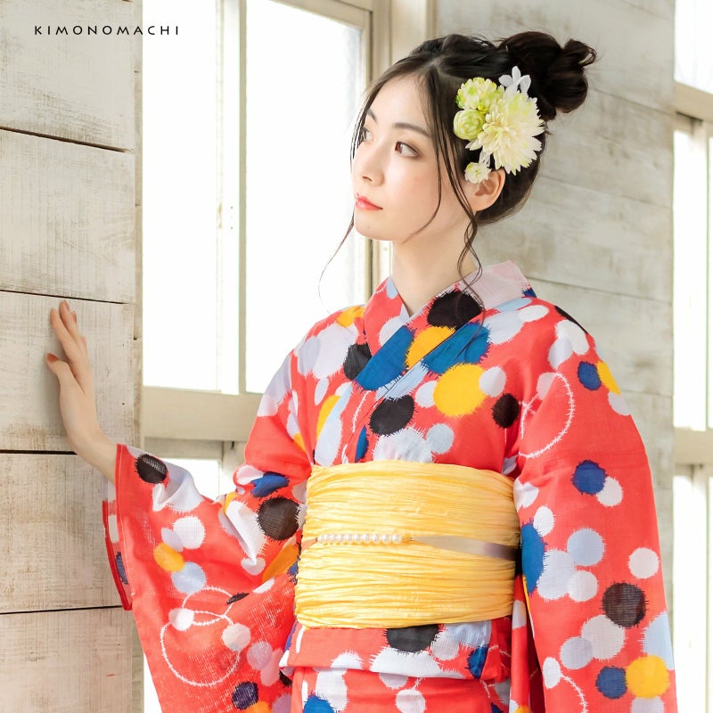 浴衣:深みのあるスモーキーなピンク色地に、重なり合う銘仙調の水玉模様。水玉は大中小のさまざまな大きさで、白色に黒色、濃い黄色に、ごく薄い水色、青色。シンプルながら、銘仙調ならではのレトロモダンでとってもオシャレ!