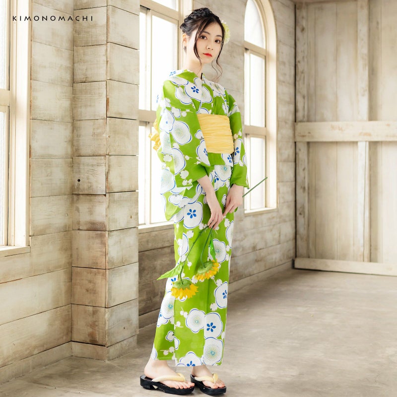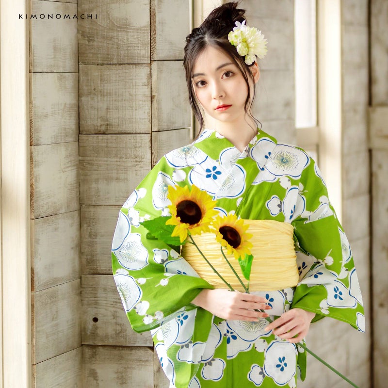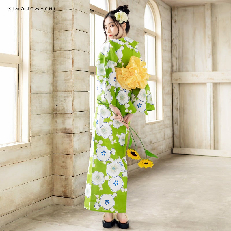 浴衣:濃い黄緑地に柔らかな丸みと曲線のある白い梅の花。花の部分には鮮やかな濃い青色のラインや、ところどころ色づいた黄色が使われています。花の間から少しだけ覗く枝の部分は薄いグレー。
