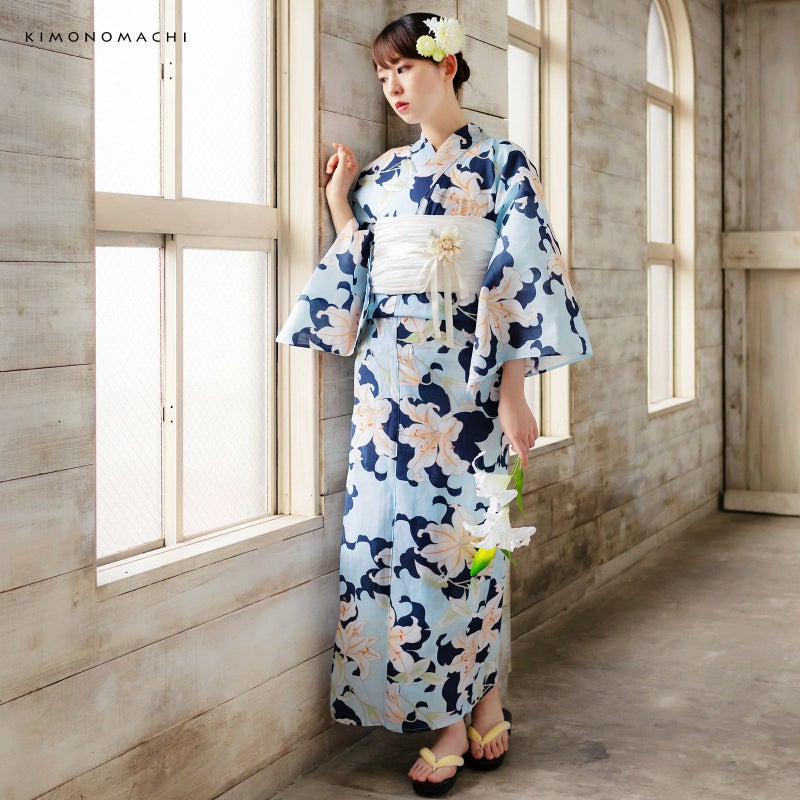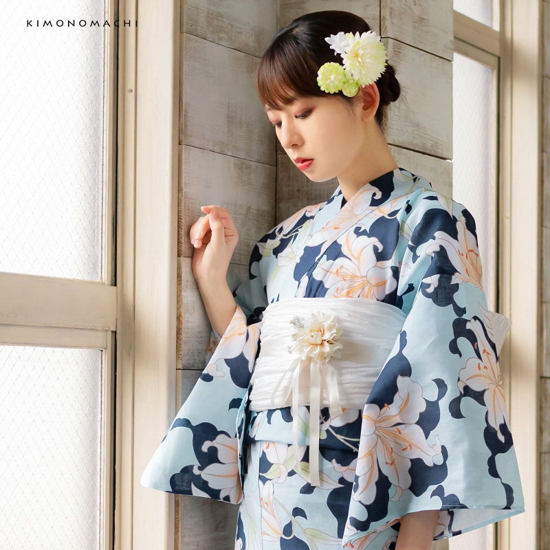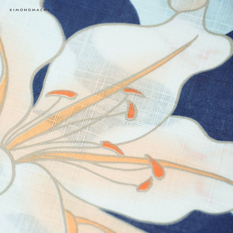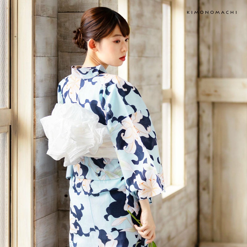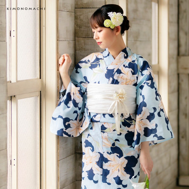 浴衣:薄い水色地に濃い紺色の百合のシルエット、薄オレンジ色ぼかしの色合いの入った百合模様。