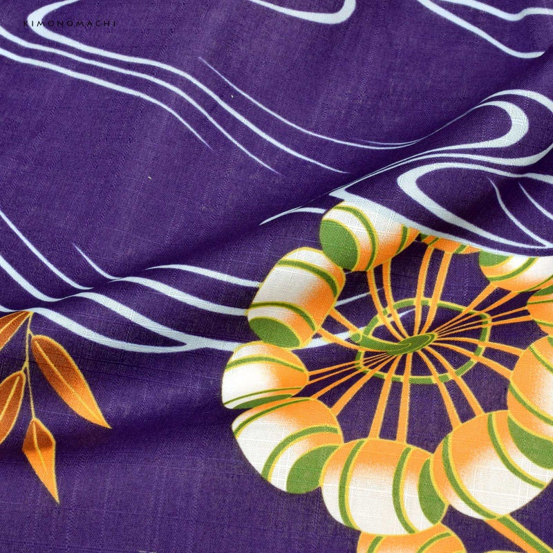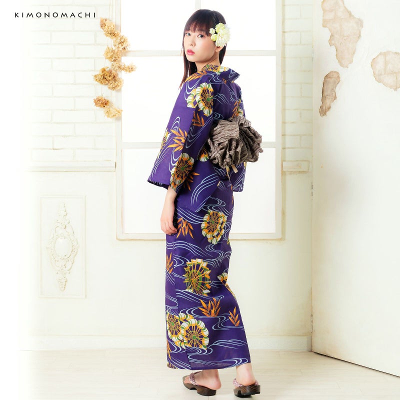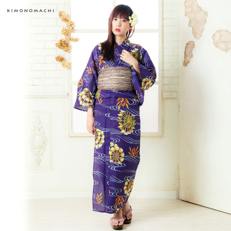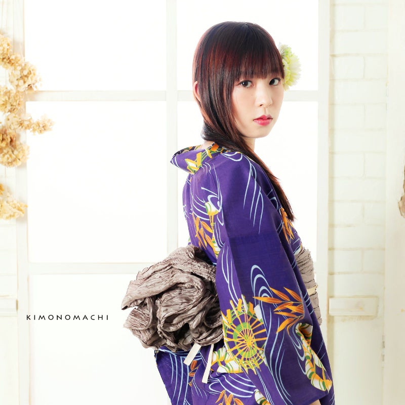 浴衣:青みのある紫色地に、水色の流水模様。水の流れの合間から、2種の水車と笹の葉が見えるのが涼しげ。水車の部分は白色と鶯色に明るいオレンジ色、ラインとところどころに黄土色。笹の葉は明るいオレンジ色に、影のように茶色がほんのりと。