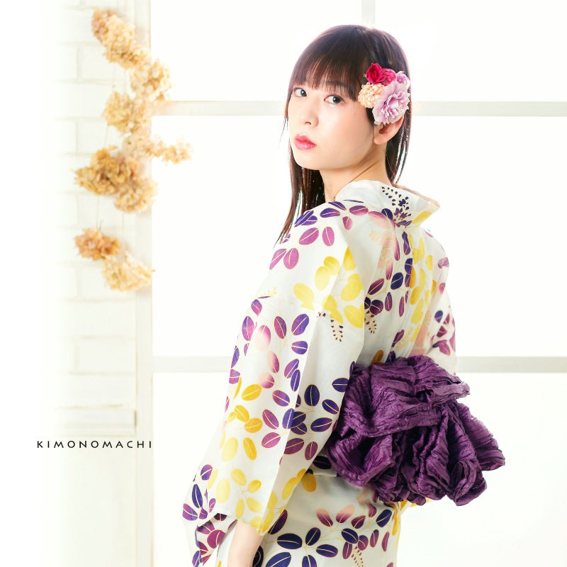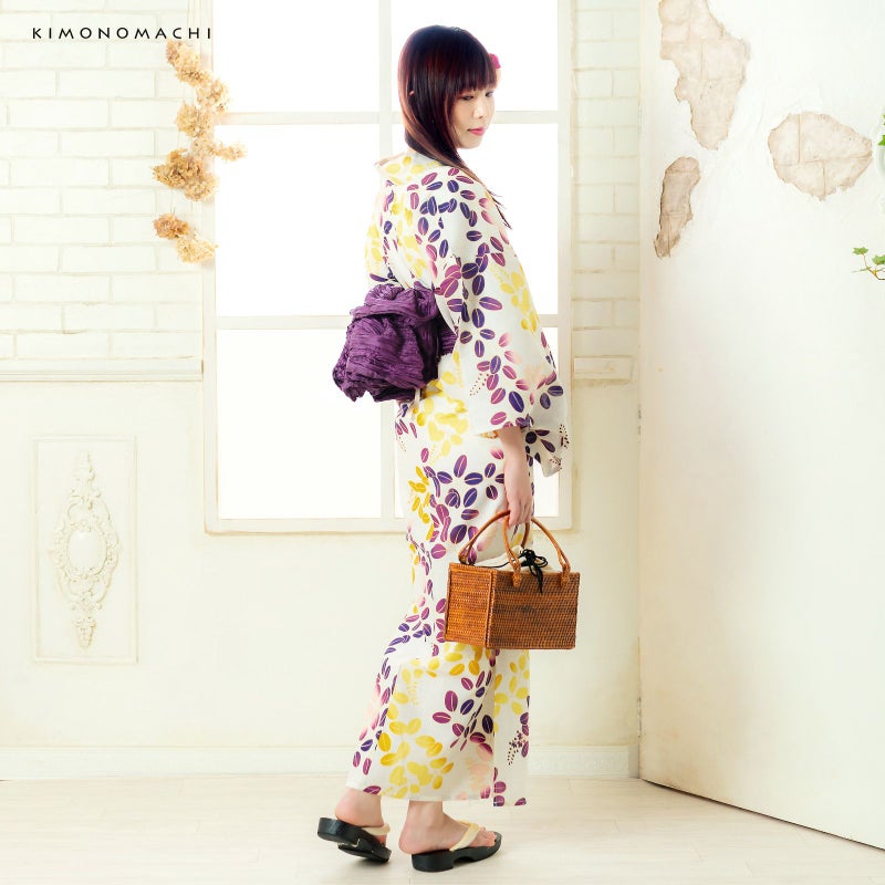 浴衣:柔らかな生成り地に紫色ぼかし、からし色ぼかしの萩模様。