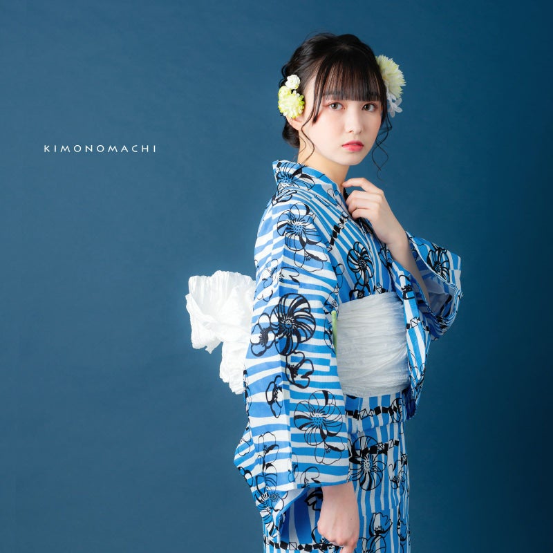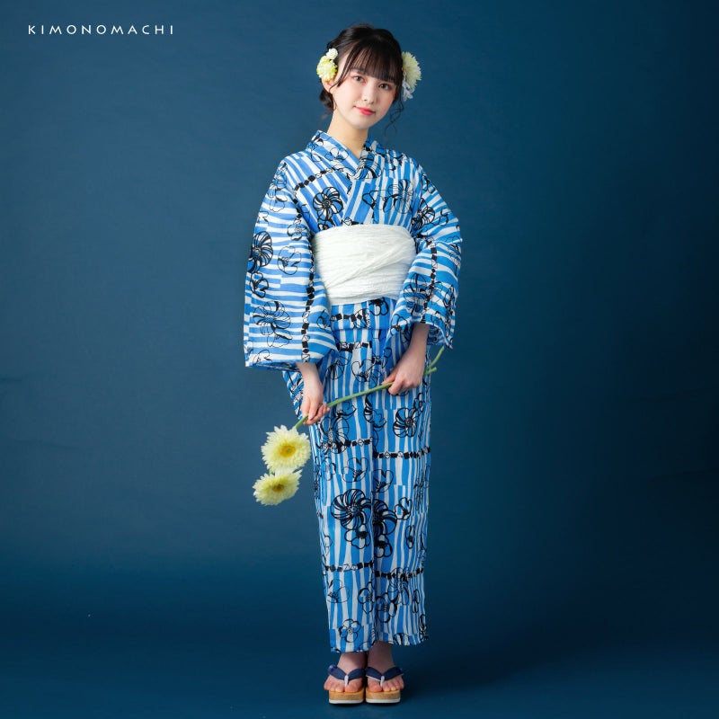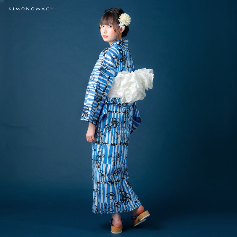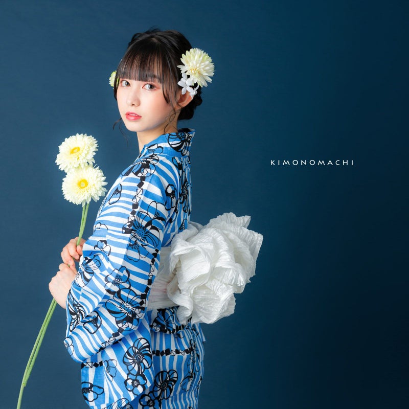 浴衣:白地に鮮やかな青色で、ややウェーブがかった不規則な太さの縦ラインがゆらゆら流れているよう。縦ラインの上に、はっきりとした黒色で、大小のポピーのようなレトロなお花と、小さなスクエアを連ねたような幾何学模様入り。
